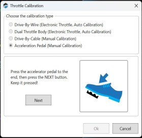 VCM Live 将提示您踩下加速踏板,一旦踏板完全踩下,请单击“下一步”。 |