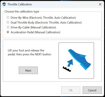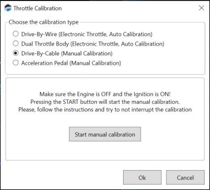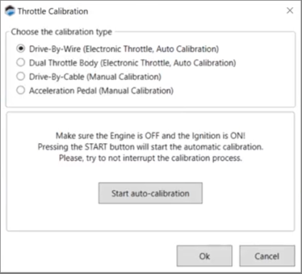 在菜单栏中,选择 ECU > 自动油门校准. 出现油门校准窗口。 |