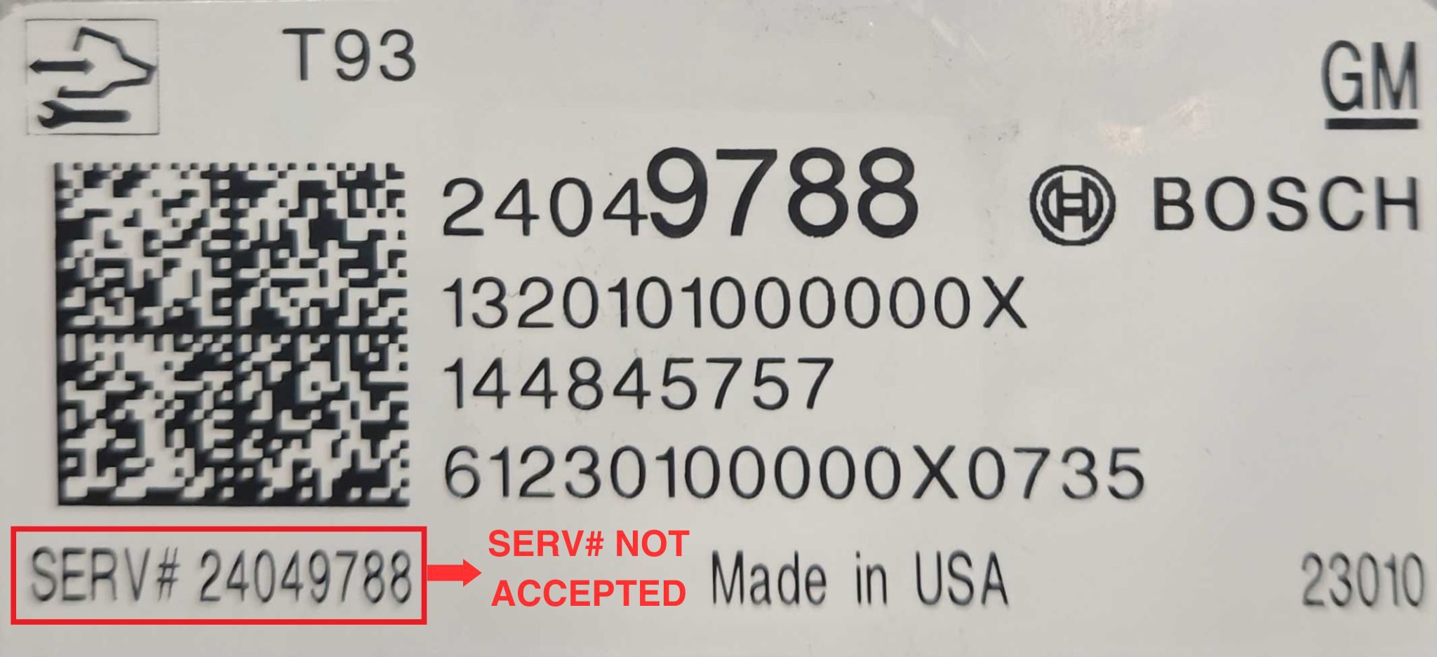 - لا تنطبق خدمات GM T93 TCM هذه على مركبات Global B. نحن لا اقبل T93 TCMs مع Serv #24049788 لأن هذا يعني أنها مركبة عالمية B. يرجى التحقق من T93 TCM الخاص بك قبل شراء أي من هذه الخدمات للتأكد من قبول T93 TCM الخاص بك. لطفا أنظر هذه الصورة لتحديد موقع Serv# على TCM الخاص بك للتحقق منه.